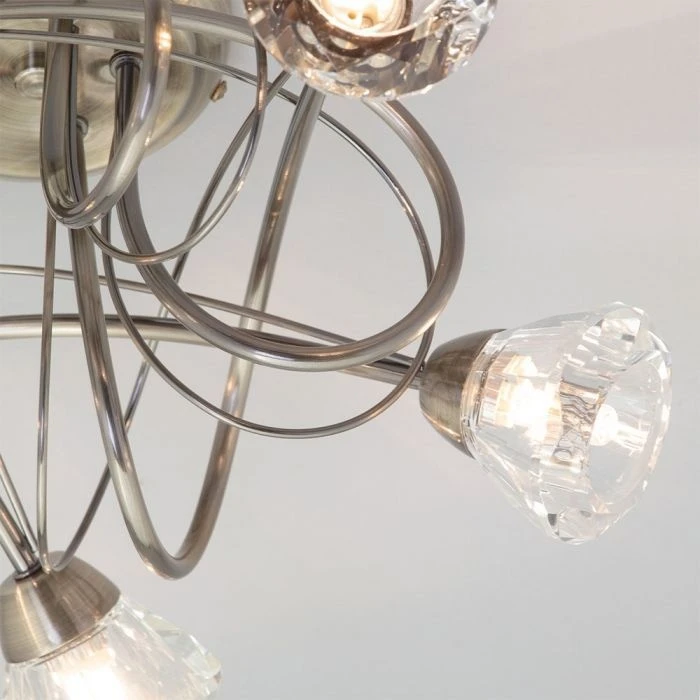 This stunning Marianne 5 light flush ceiling fitting is perfect for rooms with lower ceilings, as it requires less drop space. Its 5 lights are perfectly placed on an arrangement of curving arms which loop in and out of each other giving a stylish knotted look. The cut glass shades gives a softer twist to the light and the antique brass colour offers a classic finish to this 5 light flush.