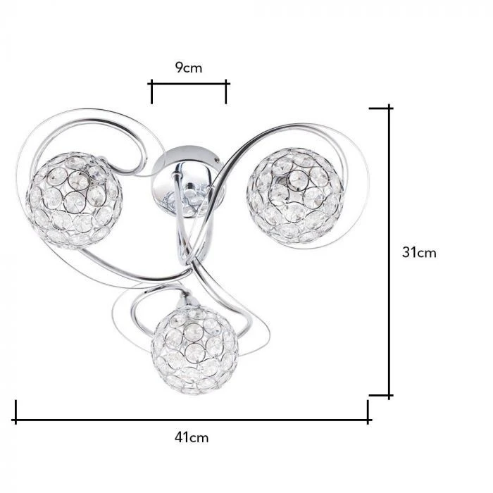 Why not combine style and practicality in your home with the Orinna flush ceiling light. The fittings having a minimal drop to help you illuminate spaces with lower ceilings, whilst the crystal effect shades give an elegant twist to your design. This flush ceiling light has a 3 light structure, with each light presented at the end of a stylish curved arm and surrounded by a contemporary ball shaped shade to give a unique glisten to the light.