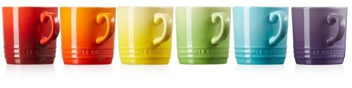 A colourful set of six Cappuccino mugs, perfect as a gift or the ideal way to start collecting in to the Le Creuset rainbow of vibrant colours. Each Le Creuset mug is crafted from premium quality clay and fired at very high temperatures to create stoneware that has a robust and high-quality finish.Â