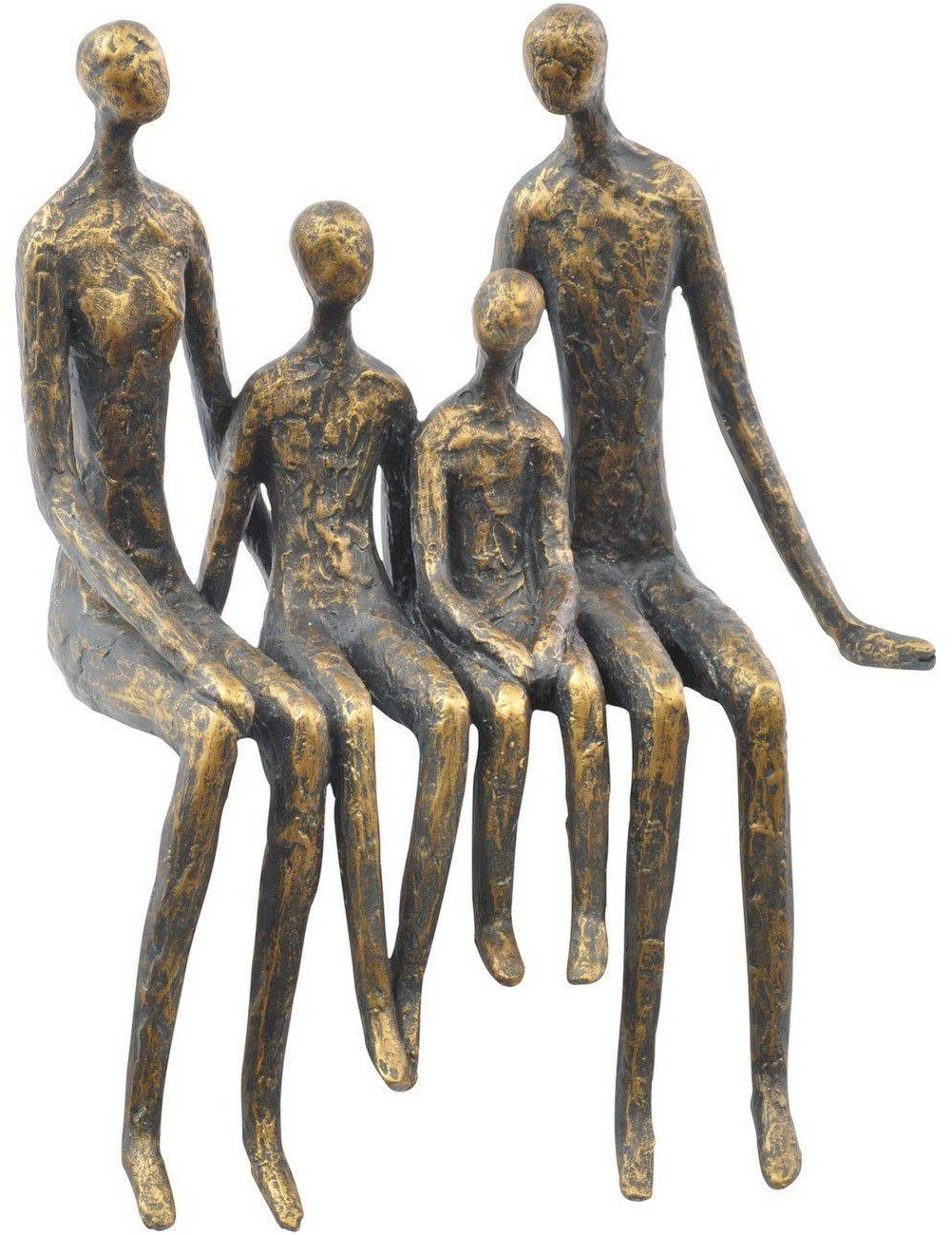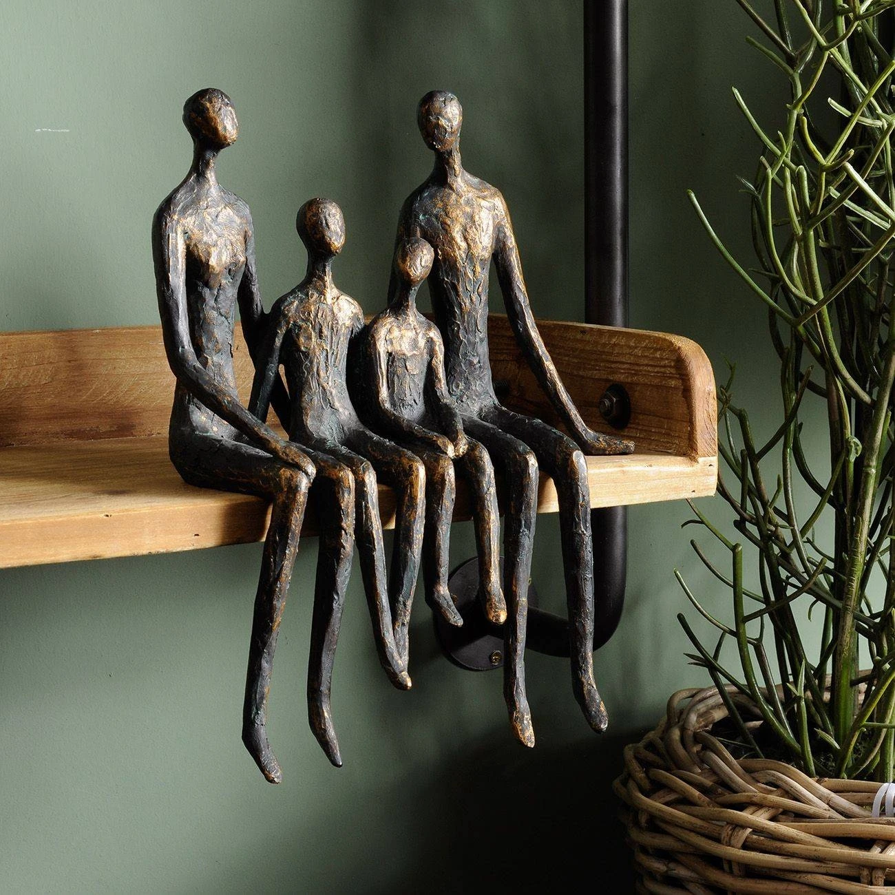 Contemporary antique bronze resin sculpture of a family of four designed to be seated on a mantelpiece or shelf edge.