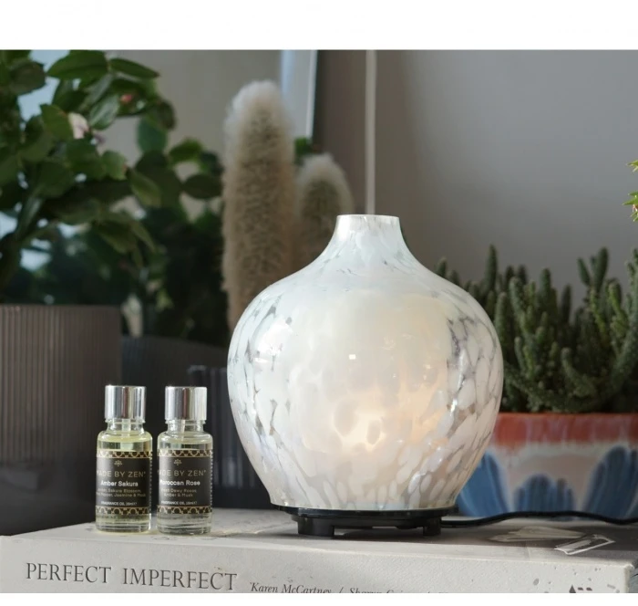 Experience serenity in style with the pearlescent Mercura White Aroma Diffuser, hand blown with a mottled glass dome. The high shine gives a beautiful iridescent glow in the home.Â