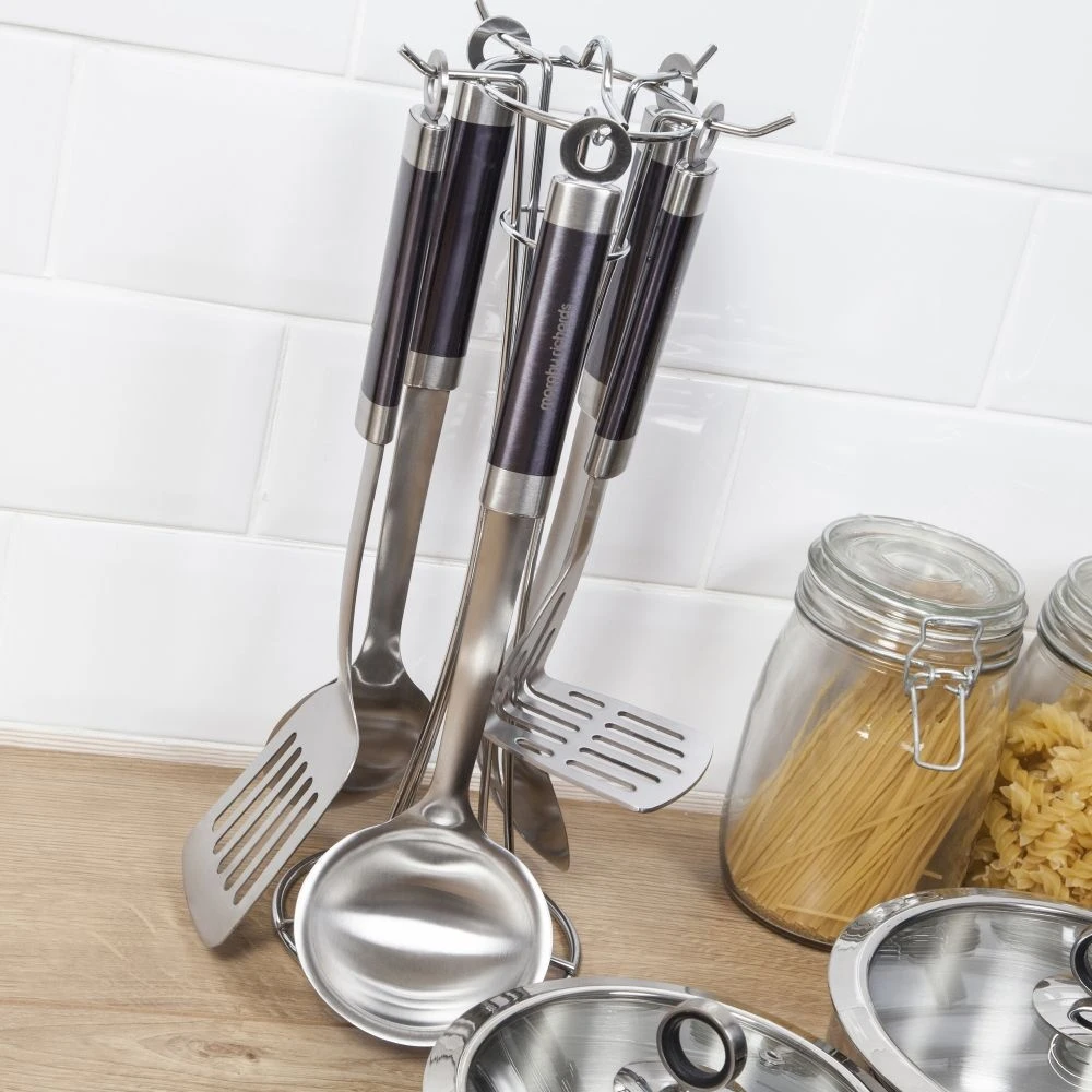 The set includes a turner, slotted spoon, solid spoon, ladle and a masher offering the ultimate in functionality.