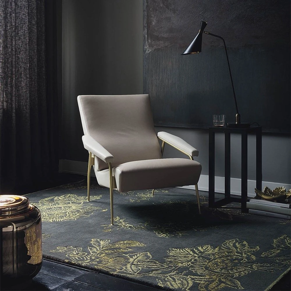 Tonquin Rugs 37005 by Wedgwood features an intricate leafy and elegant rose-like bloom in golden tones against a plain charcoal grey background which exudes classical elegance.
